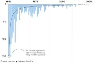 España lleva ya cuatro años consecutivos sin récords de días fríos para las mismas fechas concretas del calendario desde al menos 1950, año en que comienza la serie histórica de la Agencia Estatal de Meteorología (Aemet).