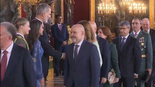 Fiesta NacionalLos Reyes saludan a los alcaldes de la dana en la recepción en el Palacio RealLos Reyes, la Princesa de Asturias y la infanta Sofía saludaron este domingo a más de medio centenar de alcaldes cuyos municipios se vieron afectados por la dana y que fueron invitados a la recepción en el Palacio Real con motivo del Día de la Fiesta Nacional