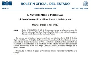 InteriorEl BOE publica el cese del DAO acusado de agresión sexualEl Boletín Oficial del Estado (BOE) publicó este jueves el cese del comisario principal José Ángel González como director adjunto operativo (DAO) de la Policía Nacional, tras la querella interpuesta por una subordinada por agresión sexual