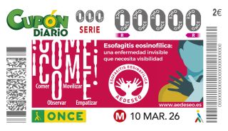Enfermedades rarasLa ONCE dedica un cupón para apoyar a los pacientes de esofagitis eosinofílica y hacer visible esta enfermedadLa ONCE dedicará su cupón del martes 10 de marzo a la Asociación Española de Esofagitis Eosinofílica (Aedeseo), con el objetivo de" apoyar a las personas que conviven con esta enfermedad y contribuir a su visibilidad". Cinco millones de cupones difundirán por toda España el mensaje: ‘Una enfermedad invisible que necesita visibilidad’, indicó la organización