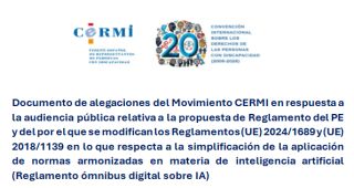 DiscapacidadEl Cermi plantea sus aportaciones al futuro reglamento ómnibus de IA de la Unión EuropeaEl Comité Español de Representantes de Personas con Discapacidad (Cermi) presentó sus aportaciones al proceso de audiencia pública abierto por la Comisión Europea (CE) sobre la futura propuesta de 'Reglamento ómnibus de inteligencia artificial (IA)', destinado a simplificar la aplicación de normas armonizadas en este ámbito estratégico para la Unión Europea (UE), según informó este lunes el Comité