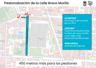 MadridEl Ayuntamiento de Madrid peatonalizará este domingo un tramo de Bravo MurilloEl 12 de octubre, día de la Fiesta Nacional, el Ayuntamiento de Madrid va a llevar a cabo una prueba piloto de peatonalización en la calle de Bravo Murillo entre la plaza de Juan Zorrilla y las calles José Abascal/Cea Bermúdez para fomentar el espacio peatonal