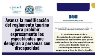 El Comité Español de Representantes de Personas con Discapacidad (Cermi) destacó este lunes el avance en la modificación del Reglamento de Espectáculos Taurinos con el objetivo de prohibir de forma expresa los espectáculos y festejos que denigren o humillen a las personas por razón de su discapacidad, "una reivindicación histórica del movimiento de la discapacidad para garantizar el respeto a la dignidad humana en estos eventos".
