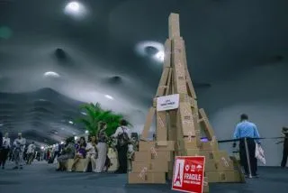 Activistas de Greenpeace levantaron este lunes en Belém (Brasil) una réplica de la icónica Torre Eiffel, de París (Francia), hecha con cajas de cartón y ante la cual había un letrero en el que se podía leer ‘Frágil. Manipular con cuidado’.