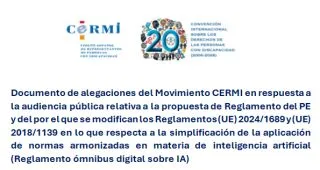El Comité Español de Representantes de Personas con Discapacidad (Cermi) presentó sus aportaciones al proceso de audiencia pública abierto por la Comisión Europea (CE) sobre la futura propuesta de 'Reglamento ómnibus de inteligencia artificial (IA)', destinado a simplificar la aplicación de normas armonizadas en este ámbito estratégico para la Unión Europea (UE), según informó este lunes el Comité.