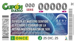 La Sociedad Española de Retina y Vítreo protagonizarán el cupón de la ONCE de este jueves. Cinco millones de cupones difundirán su labor por toda España, con el lema 'Tu vista es nuestro sentido. El estudio y cuidado de la retina nuestra razón de ser'.