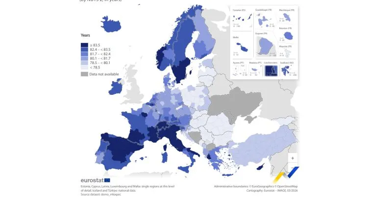 La Comunidad de Madrid es la región con mayor esperanza de vida de la Unión Europea, con 86,1 años de media, según los datos ofrecidos este viernes por oficina estadística de la Unión Europea (Eurostat). La Comunidad Foral de Navarra ocupa el segundo lugar en el ránking español, con 85 años de media.