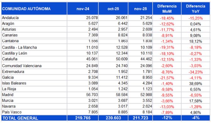LaboralInfoJobs roza las 212.000 vacantes de empleo en noviembre en EspañaInfoJobs alcanzó un total de 211.723 vacantes de empleo en noviembre en España, un 4% menos que en noviembre de 2024, cuando alcanzaron los 219.765 puestos de trabajo, y un 12% inferior al dato de octubre de 2025, cuando la plataforma reportó 239.603 vacantes.