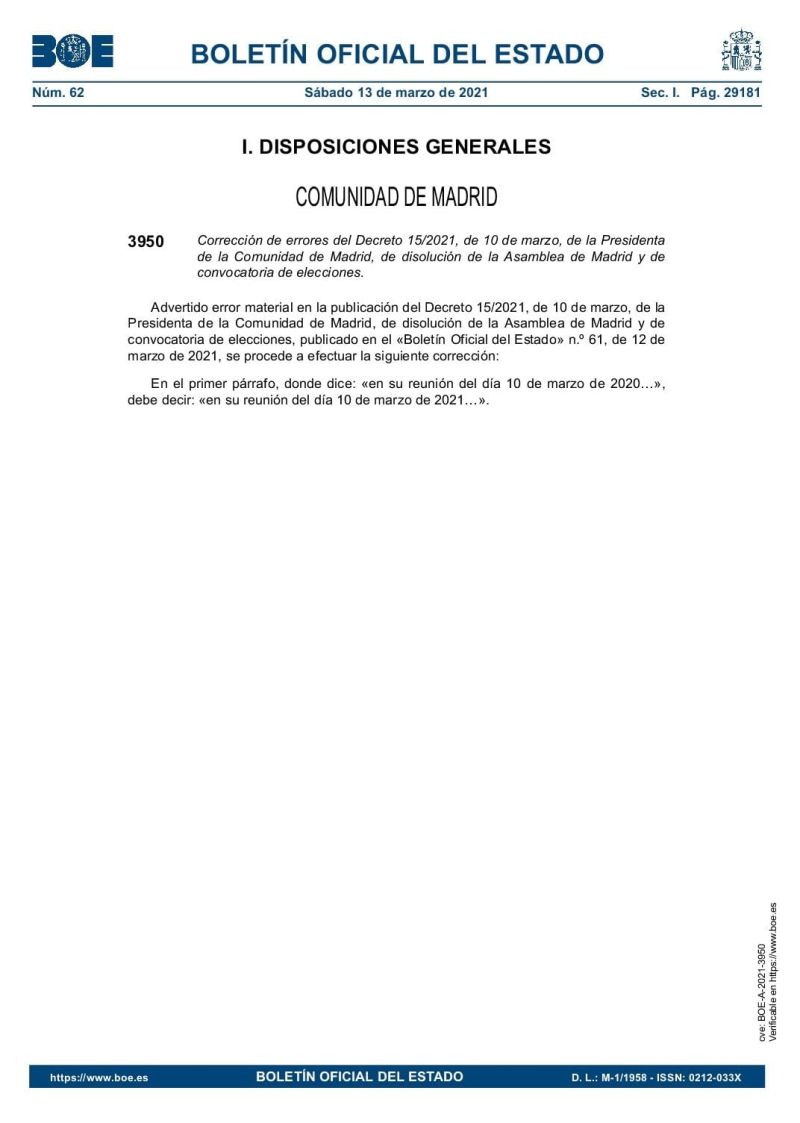 MadridEl BOE corrige el decreto de elecciones de AyusoEl Boletín Oficial del Estado (BOE) publicó este sábado la corrección de errores del decreto de convocatoria de elecciones en la Comunidad de Madrid firmado por Isabel Díaz Ayuso disolviendo la Asamblea y llamando a las urnas el 4 de mayo.
