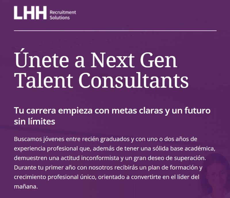 EmpresasNextGen Talent Consultants Program, la apuesta de LHH por desarrollar e incorporar a los talentos del futuroLHH, especializada en soluciones integrales de talento de The Adecco Group, bajo el claim 'Tu carrera empieza con metas claras y un futuro sin límites', ha puesto en marcha el programa LHH NextGen Talent Consultants. Con esta iniciativa, LHH busca ofrecer a profesionales comprometidos la oportunidad de embarcarse en un plan de formación y crecimiento profesional único, orientado a forjar a los líderes que inspirarán el futuro.