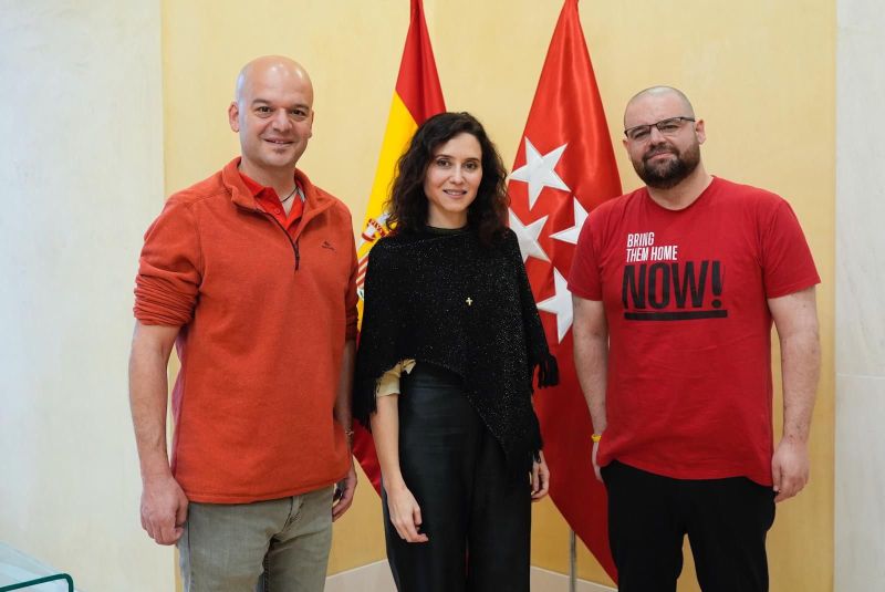 MadridAyuso recibe en Sol a un hombre secuestrado dos años por HamásLa presidenta de la Comunidad de Madrid, Isabel Díaz Ayuso, recibió este jueves en la Real Casa de Correos, sede de la Presidencia regional, a Eitam Horn, un hombre argentino que sufrió dos años de secuestro en los túneles de Hamás.
