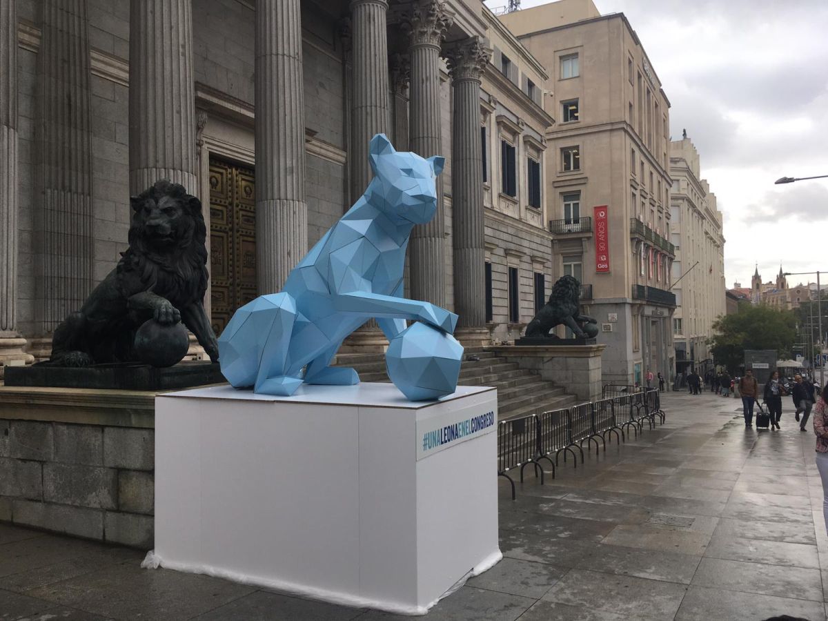 Una leona custodia este miércoles la entrada principal del Congreso de los Diputados junto a los leones 'Daoiz' y 'Velarde', una acción que pretende poner en valor el papel de las mujeres y las niñas en política.