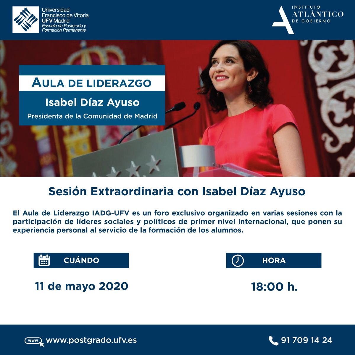 La presidenta de la Comunidad de Madrid, Isabel Díaz Ayuso, participará mañana lunes a las 18 horas en una nueva sesión extraordinaria del Aula de Liderazgo del Instituto Atlántico de Gobierno (IADG) y la Escuela de Postgrado de la Universidad Francisco de Vitoria (UFV).