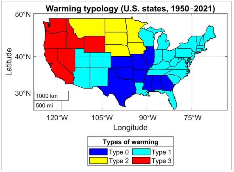 Un total de 41 estados de Estados Unidos se están calentando al menos desde 1950, aunque con patrones distintos de calentamiento climático porque los de la costa oeste experimentan aumentos de temperaturas anuales más altas y muchos del norte lo hacen más ligeramente.