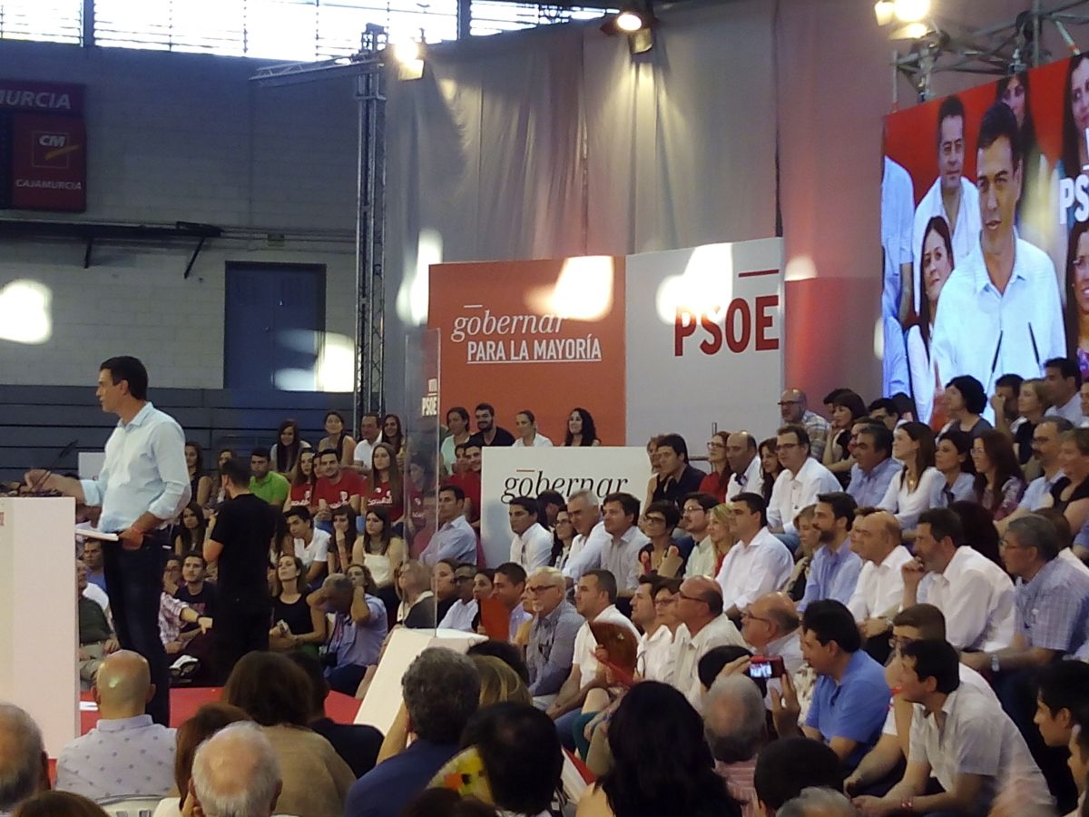 Interrumpido en varias ocasiones por gritos de “presidente, presidente” y de “Pedro, Pedro”, el líder del PSOE insistió en que “lo mejor” que le ha ocurrido a este país “siempre” ha venido de la mano de los socialistas, afirmación que siempre es respondida por los presentes con grandes aplausos. Ello le llevó a reivindicar que “nosotros somos el gran partido de España”. El público murciano, por el momento, ha sido el que se ha mostrado más entregado con el líder socialista durante estos días de campaña.