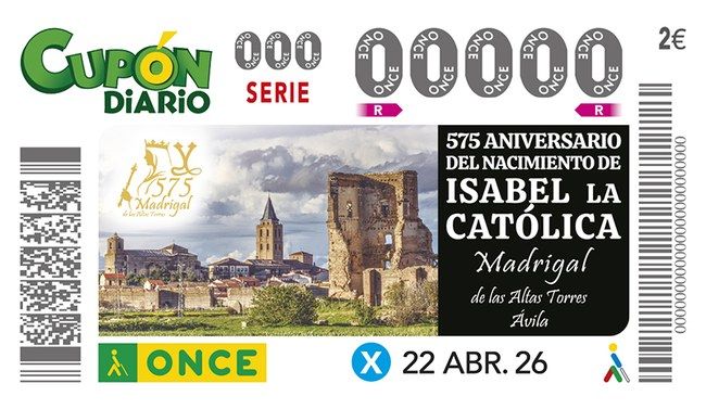 El 575 aniversario del nacimiento de Isabel la Católica protagonizará el cupón de la ONCE del próximo miércoles, 22 de abril. Cinco millones de cupones difundirán su figura por toda España.
