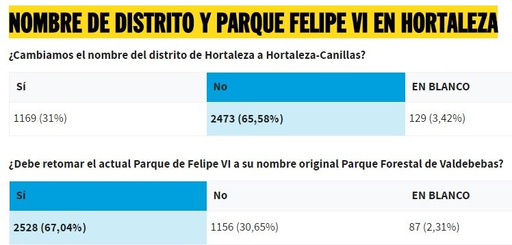 Sólo el 30,65% de los votantes de este distrito se han opuesto al cambio de nombre, por lo que este emplazamiento retomará su título original. Asimismo, la otra propuesta para cambiar el nombre de distrito por el de Hortaleza-Canillas, una antigua reclamación vecinal, ha sido rechazada con el 65,58% de votos en contra.