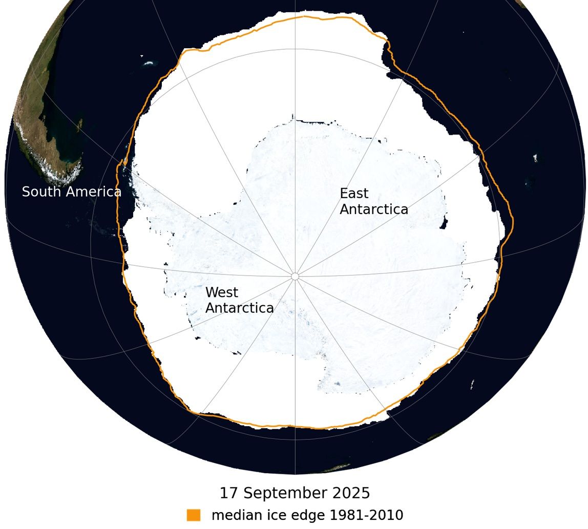 La extensión del hielo marino de la Antártida alcanzó probablemente su extensión máxima de este año el pasado 17 de septiembre con 17,81 millones de kilómetros cuadrados, lo que supone la tercera cifra más baja en el registro satelital histórico, que comienza en 1979.