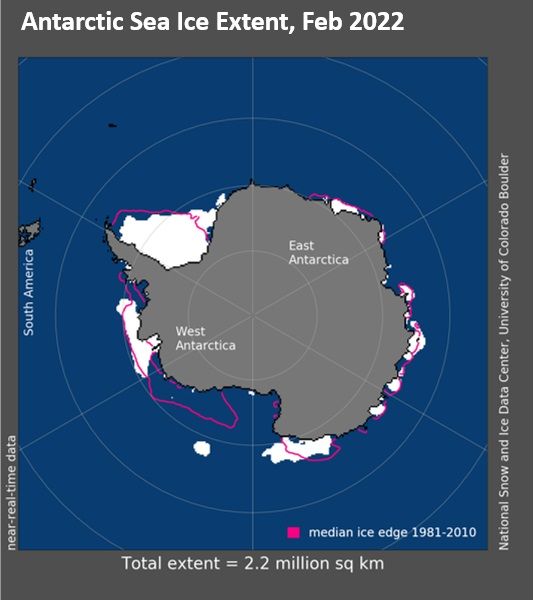 La extensión del hielo marino en la Antártida durante el mes pasado fue la más baja de febrero desde que el registro histórico por satélite comenzara en 1979, con una media de 2,16 millones de kilómetros cuadrados.