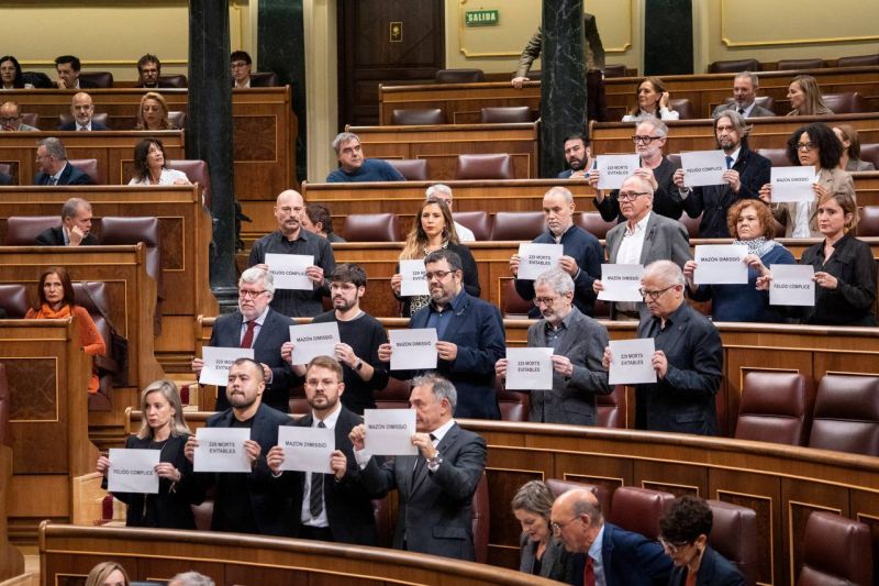 Aniversario danaSumar pide la dimisión de Mazón y asegura que las 229 víctimas en la Comunidad Valenciana eran “evitables”El Grupo Parlamentario Sumar mostró este miércoles unos carteles durante la sesión de control al Gobierno en el Congreso en los que pedía la dimisión del presidente de la Comunidad Valenciana, Carlos Mazón, y en los que se aseguraba que las 229 víctimas que hubo en esta región por la dana eran “evitables”.