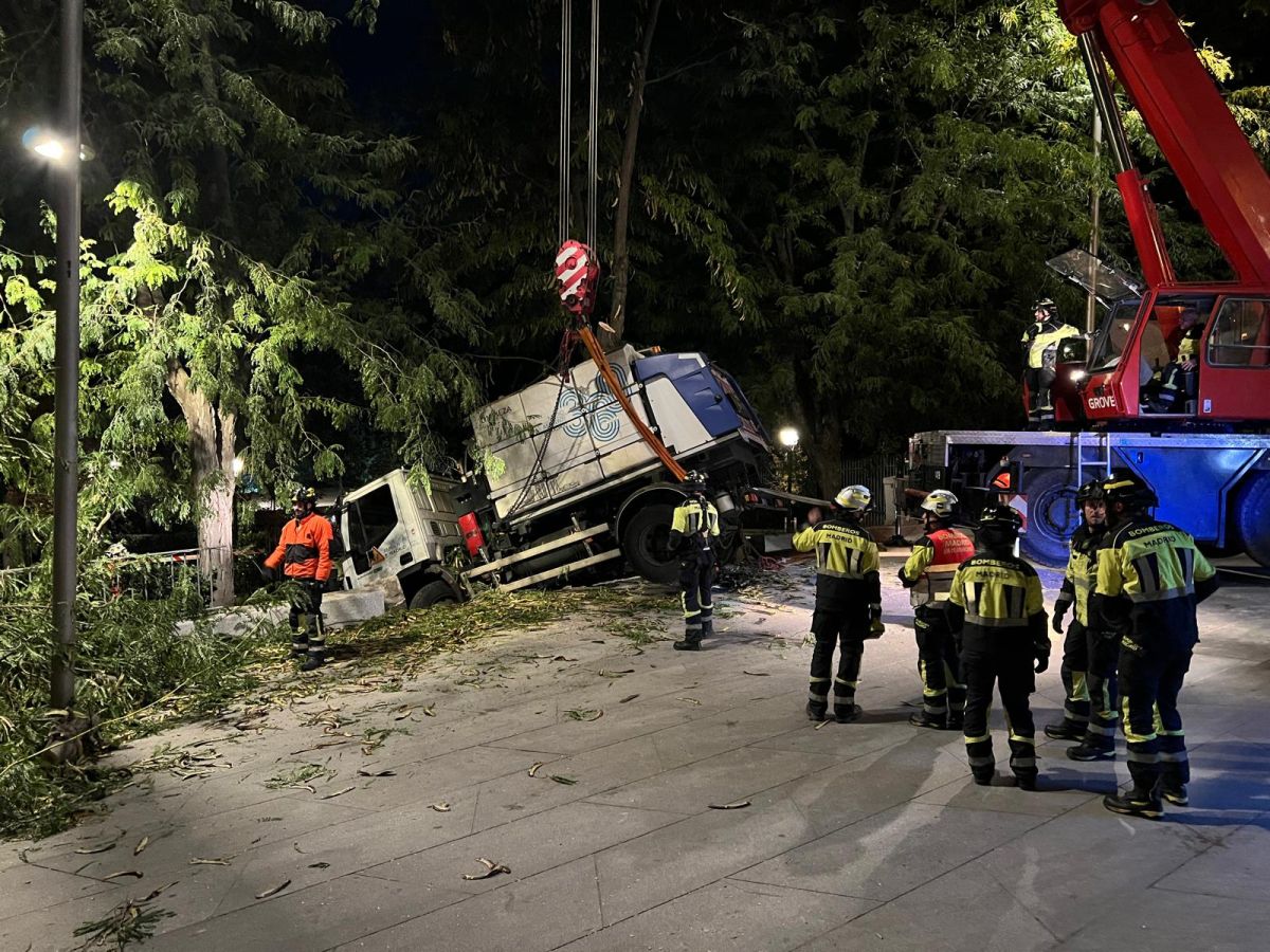 Un camión baldeadora de limpieza del Ayuntamiento de Madrid se precipitó esta noche por la cuesta de la Vega hasta quedar atascado entre dos árboles y colgando de una zona ajardinada sin dejar ningún herido.