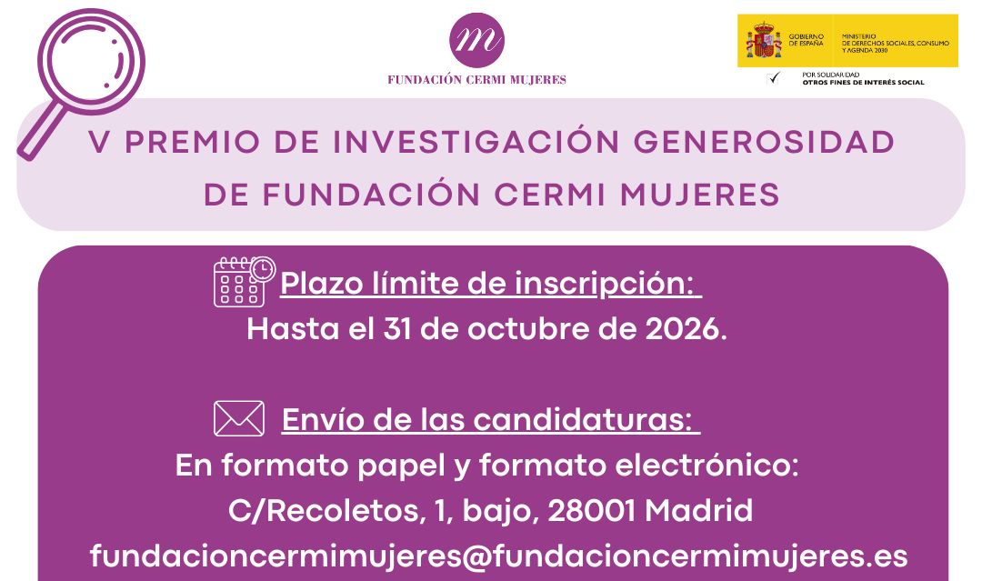 La Fundación Cermi Mujeres convoca el V Premio de Investigación Generosidad 2026, "una iniciativa destinada a reconocer y promover investigaciones científicas feministas que contribuyan al avance de la igualdad de las mujeres y niñas con discapacidad desde una perspectiva de derechos humanos", según comunicó la entidad.