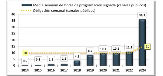 El subtitulado continúa siendo la medida de accesibilidad más implantada. Entre 2021 y 2024, los canales privados alcanzaron una media del 92,5 % de programación subtitulada, mientras que los canales públicos llegaron al 98,9 %, superando ampliamente los mínimos legales. En la televisión pública en abierto, los niveles de subtitulado se sitúan cerca del 100 %, y superan el noventa por ciento en el caso de las cadenas privadas.