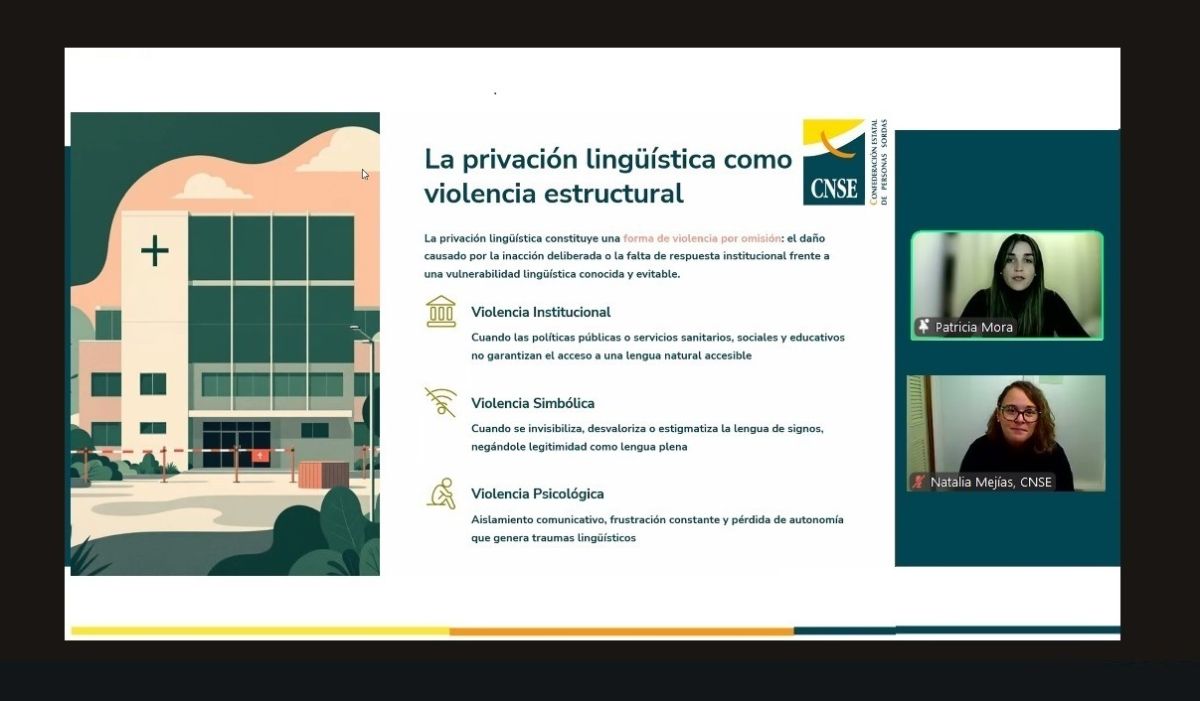 La asesora jurídica de la CNSE, Patricia Mora, presentó el análisis legal de esta problemática y enumeró efectos como retrasos lingüísticos, déficits cognitivos, aislamiento social, dificultades en funciones ejecutivas, fragilidad identitaria, brechas educativas y problemas de salud mental, para argumentar que la privación lingüística no podía seguir tratándose como un problema individual. Mora vinculó esta omisión con la violencia institucional y simbólica recogida en la Estrategia de Erradicación de la Violencia contra la Infancia y la Adolescencia (EEVIA), y subrayó que reconocerla como tal resultaba imprescindible para garantizar derechos como la comunicación, la educación inclusiva y la participación social, según argumentó.