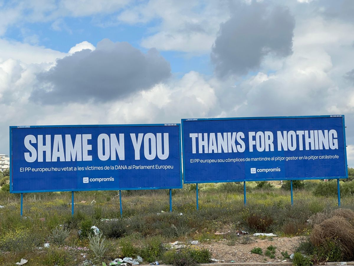 En las vallas se pueden leer mensajes como: "Thanks for nothing, el PP europeo sois cómplices de mantener al peor gestor en la peor catástrofe" o "Shame on you, el PP europeo ha vetado a las víctimas de la Dana en el Parlamento Europeo"