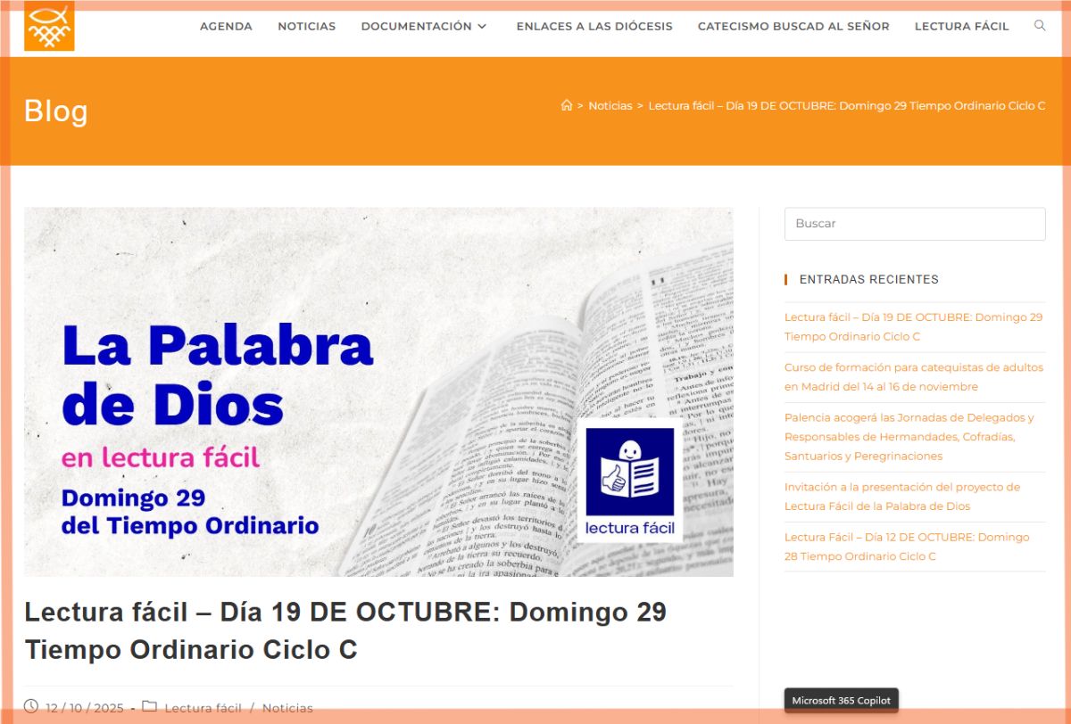 La iniciativa de ‘La Palabra de Dios en Lectura Fácil’ está desarrollada por el Área de personas con discapacidad y tiene como objetivo acercar el Evangelio a quienes tengan dificultades de comprensión, favoreciendo que todo el mundo tenga acceso a la Sagrada Escritura. De esta manera, la Comisión publica cada domingo las lecturas correspondientes adaptadas a este formato.