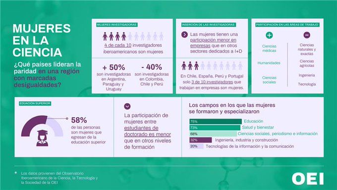 La Organización de Estados Iberoamericanos para la Educación, la Ciencia y la Cultura (OEI) informó de que cuatro de cada diez personas que investigan en Iberoamérica son mujeres, aunque persisten marcadas desigualdades entre países y sectores.