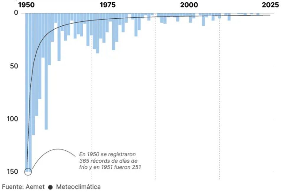 España lleva ya cuatro años consecutivos sin récords de días fríos para las mismas fechas concretas del calendario desde al menos 1950, año en que comienza la serie histórica de la Agencia Estatal de Meteorología (Aemet).