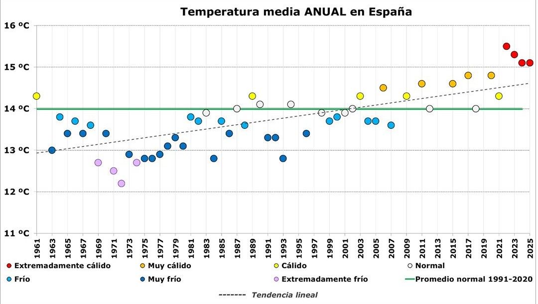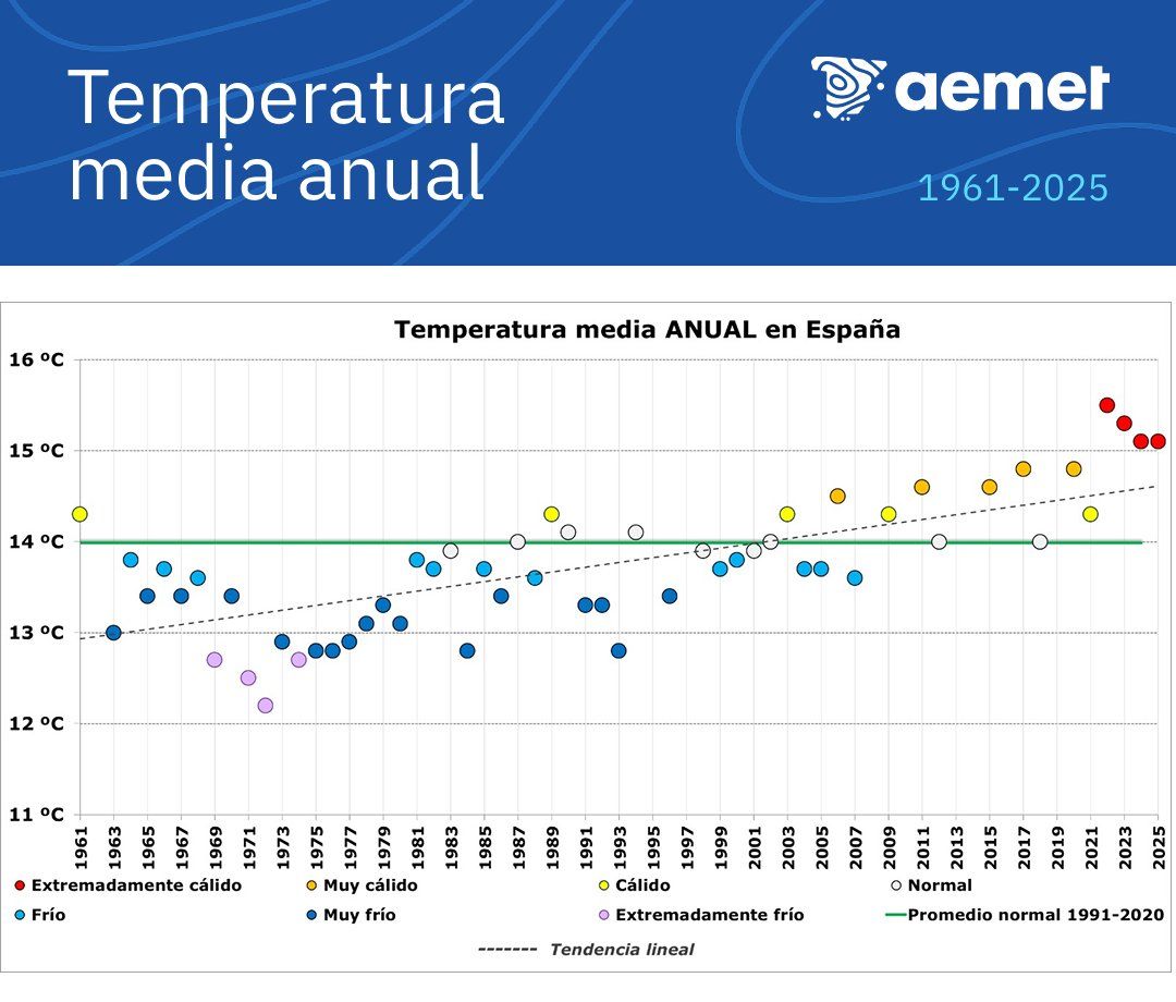 España tuvo en 2025 una temperatura media de 15 °C, lo que supone 1,1 °C más que el promedio del periodo 1991–2020, y lo sitúa entre los años más cálidos de la serie histórica, según los datos difundidos por la Agencia Estatal de Meteorología (Aemet) en su balance climático anual. 2025 fue el tercer año más cálido de la serie, empatado con 2024, lo que supone cuatro años consecutivos con "un carácter extremadamente cálido".