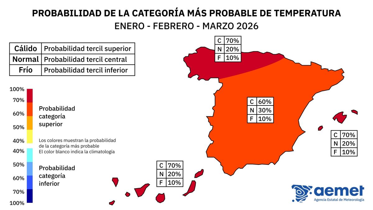 El primer trimestre de este año será más cálido de lo normal en toda España, mientras que lloverá menos de lo habitual en Canarias.