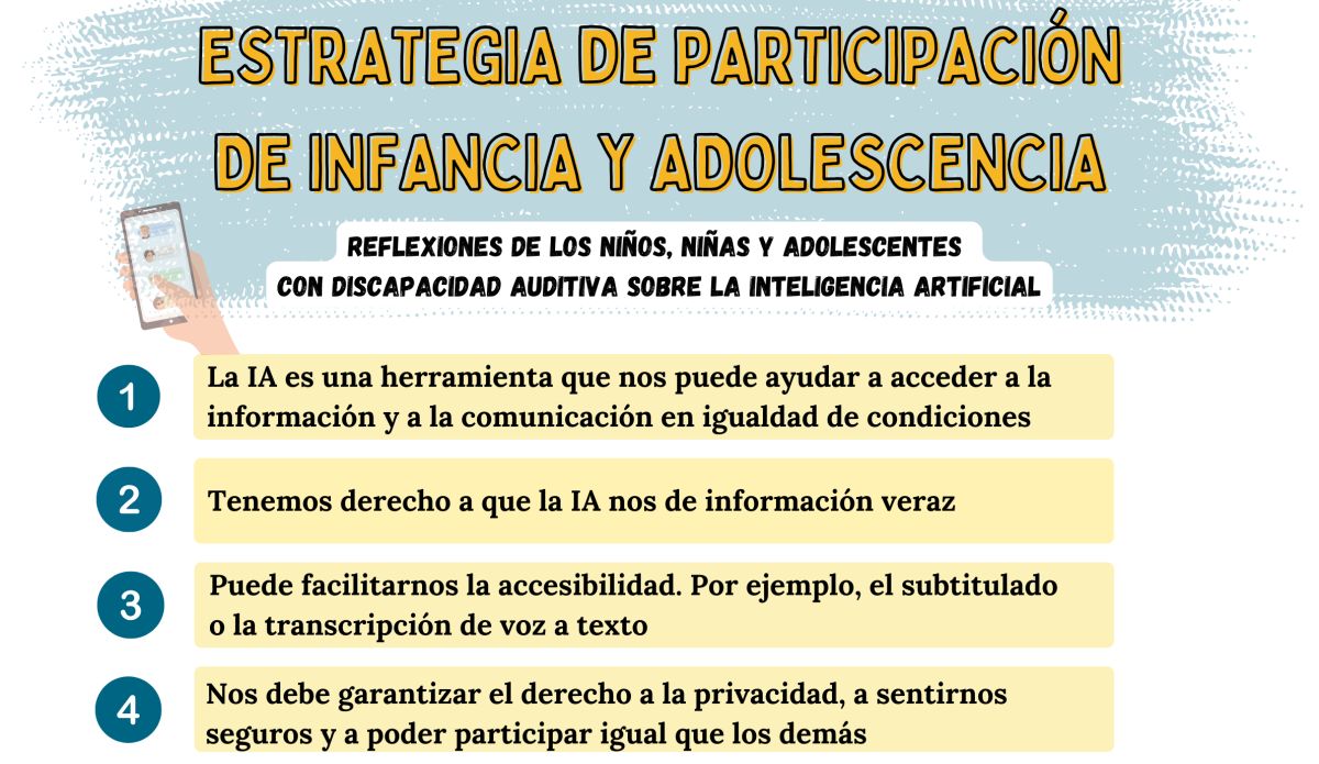 La inteligencia artificial (IA) como herramienta de acceso a la información y a la comunicación en igualdad de condiciones, la promoción de la accesibilidad, la inclusión y el respeto, y el derecho a la privacidad, son algunas de las principales reflexiones recogidas en este decálogo, que "mantiene firme su demanda de que esta herramienta ha de velar por la protección de los niños, niñas y adolescentes con discapacidad auditiva y ha de ayudar a avanzar en derechos", informó Movimiento Asociativo de Familias-Confederación Española de Familias de Personas Sordas (Fiapas).