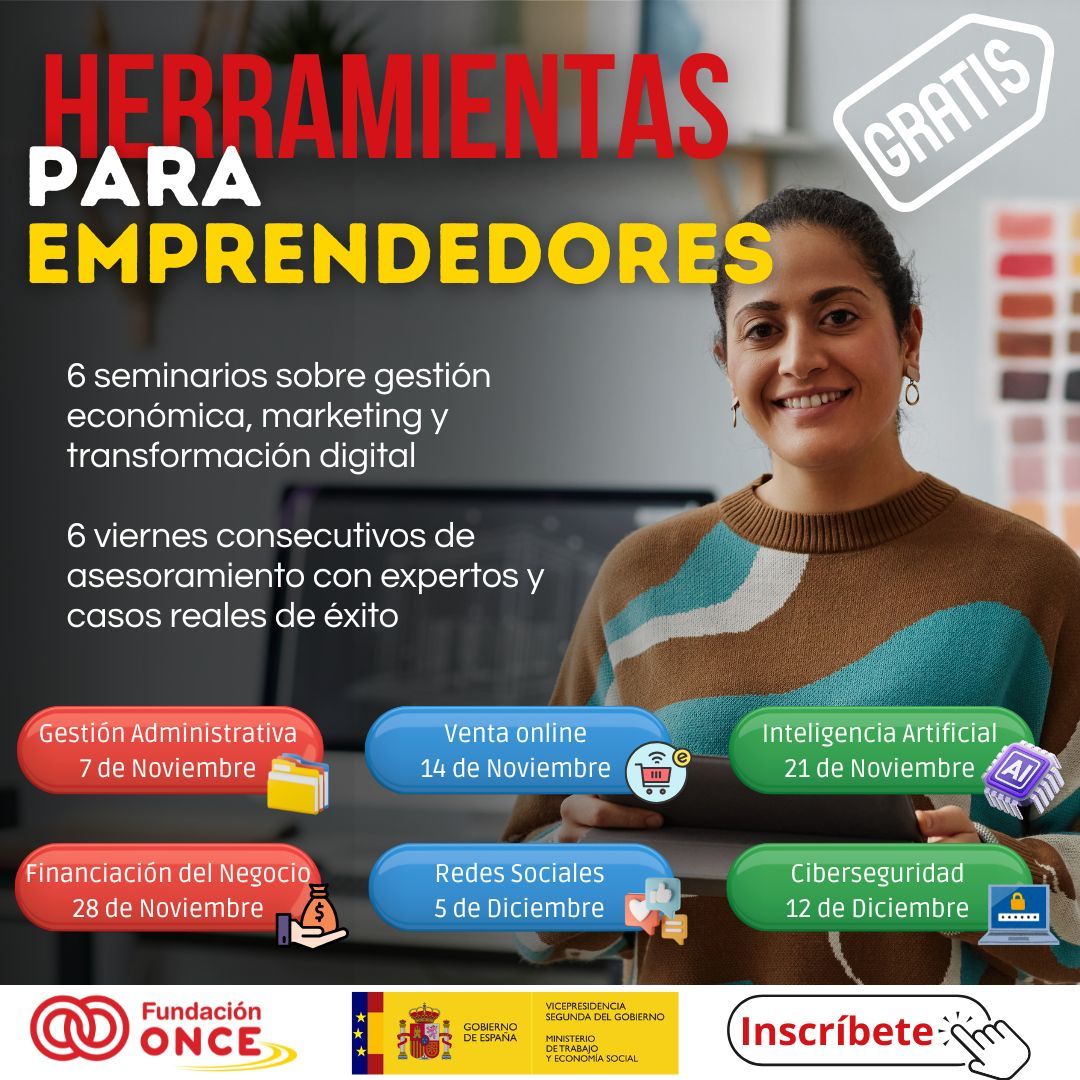 Se trata de 6 seminarios especializados durante seis viernes consecutivos en los que se abordarán temáticas diferentes para ayudar al desarrollo del emprendimiento, como gestión administrativa, venta online de productos, inteligencia artificial, financiación, gestión de redes sociales y ciberseguridad.