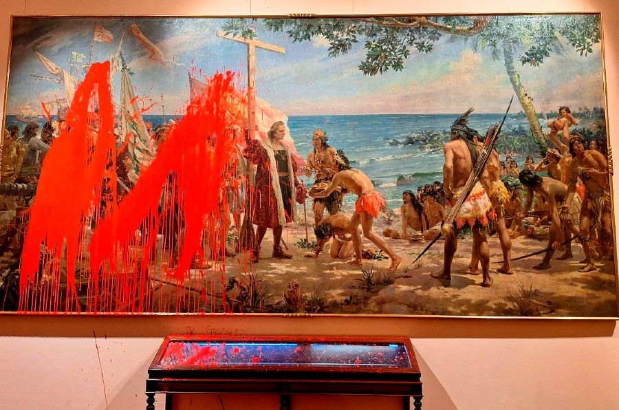 Las atacantes lanzaron pintura roja biodegradable sobre el cuadro ‘Primer homenaje a Cristóbal Colón’, de José Garnelo. Las dos autoras de la agresión justificaron su acción porque querían usar sus "privilegios de mujeres blancas" para servir de altavoz a los pueblos originarios, al tiempo que añadieron que esta obra "glorifica el colonialismo y el genocidio".