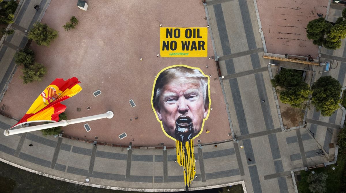 Activistas de Greenpeace desplegaron esta mañana en el suelo de la plaza de Colón, en Madrid, una imagen gigante del presidente de Estados Unidos, Donald Trump, vomitando petróleo sobre una fuente teñida de negro junto al mensaje en inglés ‘No oil, no war’ (‘No petróleo, no guerra’).