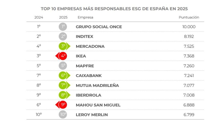 La 15ª edición del ranking Merco ESG España lo lidera, por quinto año consecutivo, el Grupo Social ONCE, seguido de Inditex (2º), Mercadona (3º), Ikea (4º), Mapfre (5º), Caixabank (6º), Mutua Madrileña (7º), Iberdrola (8º), Mahou San Miguel (9º) y Leroy Merlin (10º), que completan los diez primeros puestos del ranking general ESG.