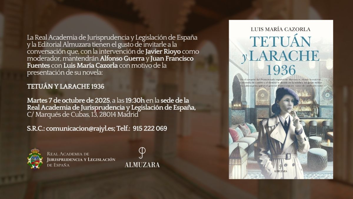 El presidente de la Real Academia de Jurisprudencia de España y actual presidente del Instituto de España, Luis María Cazorla, presentará el próximo martes, 7 de octubre, su última novela, 'Tetuán y Larache 1936'. En el acto intervendrán el exvicepresidente del Gobierno Alfonso Guerra y el historiador Juan Francisco Fuentes y estará moderado por el periodista y director de cine Javier Rioyo.