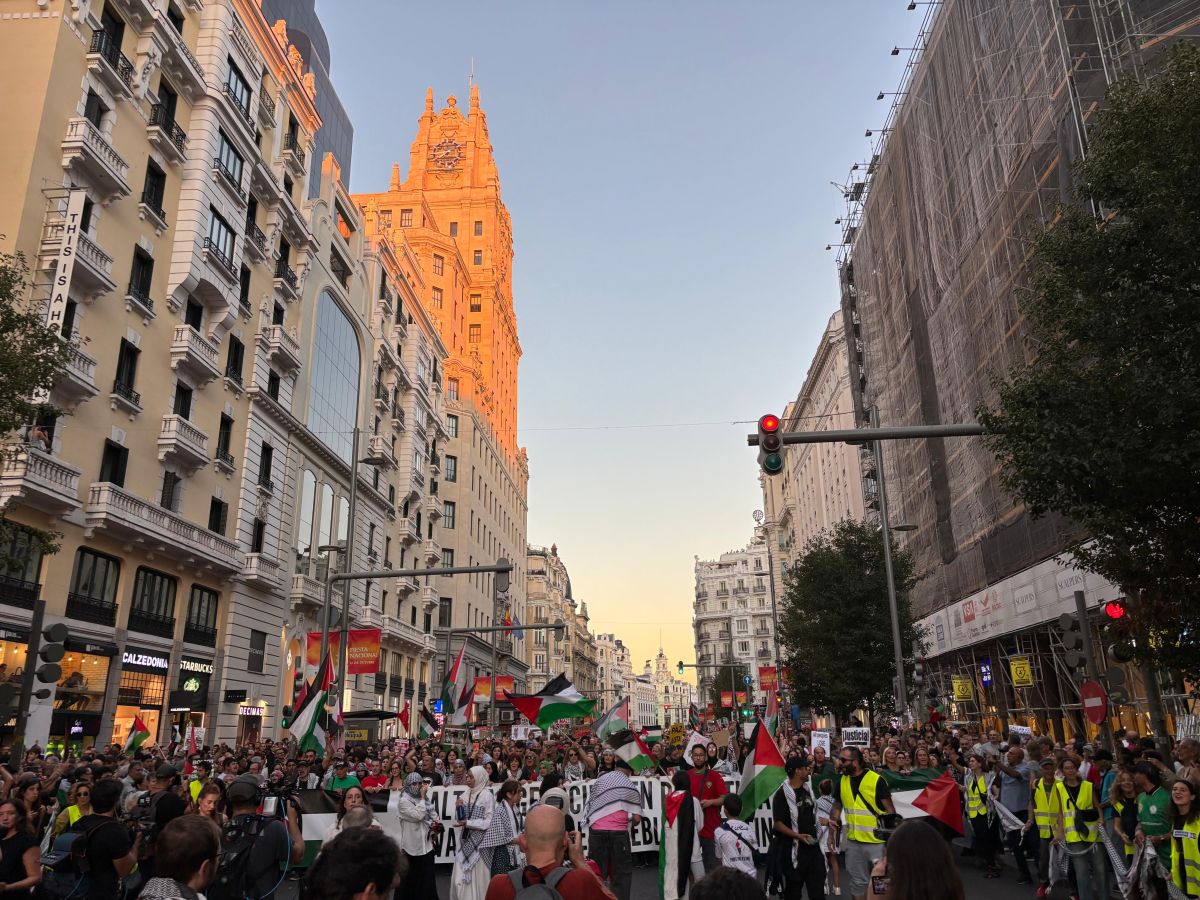 Portavoces de la organización de la marcha multitudinaria a favor de Palestina celebrada este sábado en Madrid leyeron un manifiesto al término de la misma en la plaza de Callao en el que llamaron a aumentar la presión sobre el Gobierno de España para imponer sanciones a Israel.