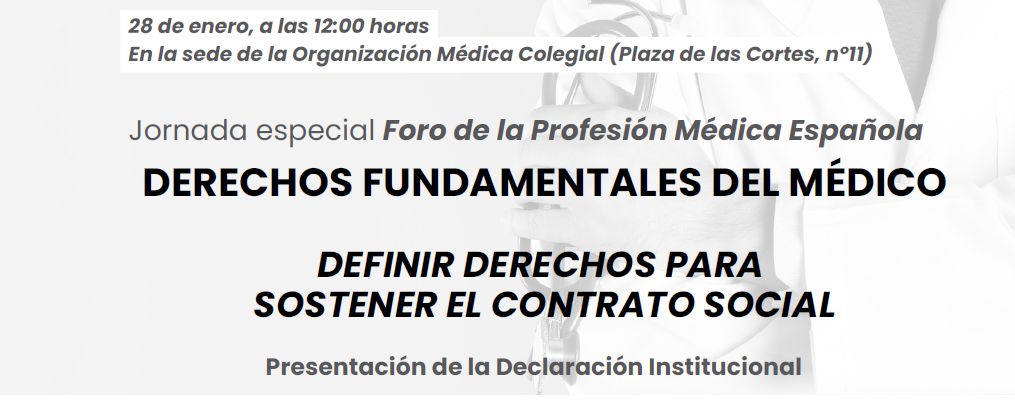 El Foro de la Profesión Médica Española celebra el próximo miércoles, a las 12.00 horas, una jornada especial en la que se presentará una declaración institucional para reivindicar los derechos fundamentales de la profesión médica, principalmente.