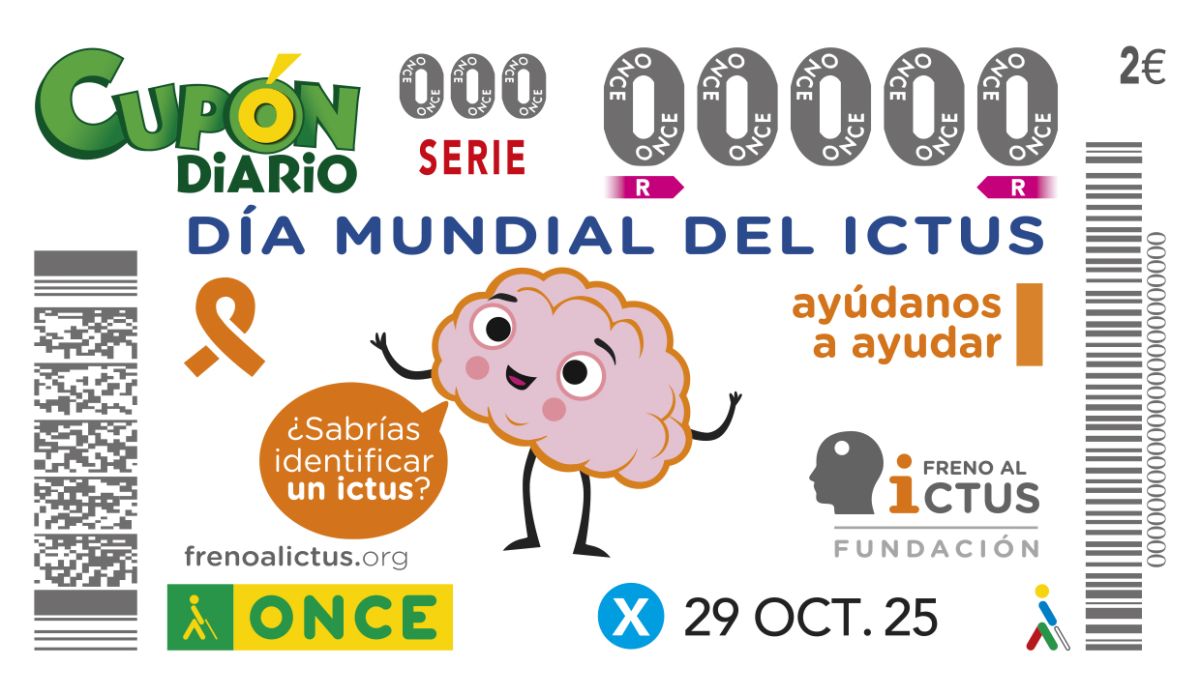 El Día Mundial del Ictus es el protagonista del cupón de la ONCE del miércoles 29 de octubre. Cinco millones de cupones con la frase ‘Ayúdanos a ayudar’ difundirán esta fecha por toda España, para apoyar a pacientes, sus familias y a quienes investigan sobre esta enfermedad.