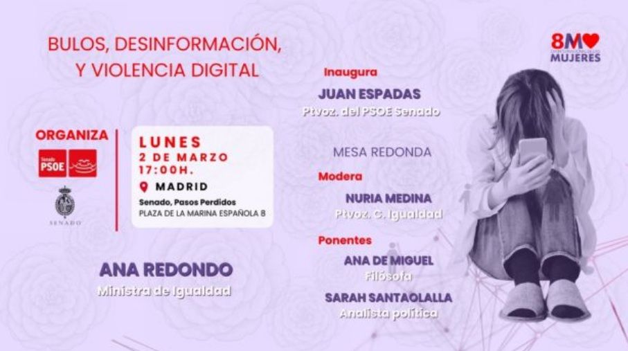 El Grupo Socialista del Senado organiza este lunes un coloquio bajo el título 'Bulos, desinformación y violencia digital', en el marco de los actos conmemorativos del Día Internacional de la Mujer que se celebra el domingo 8 de marzo.