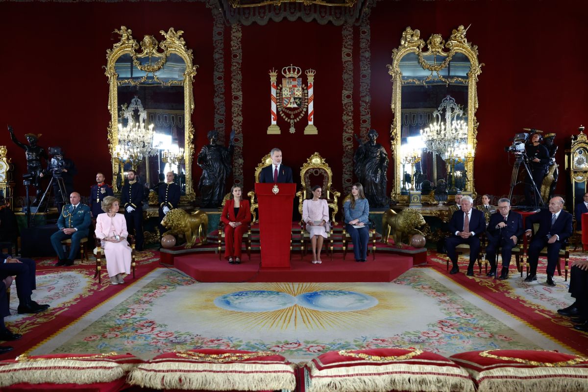 El Rey pronunció su discurso acompañado por la Reina, la Princesa de Asturias y la infanta Leonor, ante un centenar de invitados en el Palacio Real donde se encontraban el presidente del Gobierno, Pedro Sánchez; la presidenta del Congreso de los Diputados, Francina Armengol; el presidente del Senado, Pedro Rollán; el presidente del Tribunal Constitucional, Cándido Conde-Pumpido, y la presidenta del Tribunal Supremo y del Consejo General del Poder Judicial, Isabel Perelló. No así el fiscal general del Estado, Álvaro García-Ortiz, tras su inhabilitación.