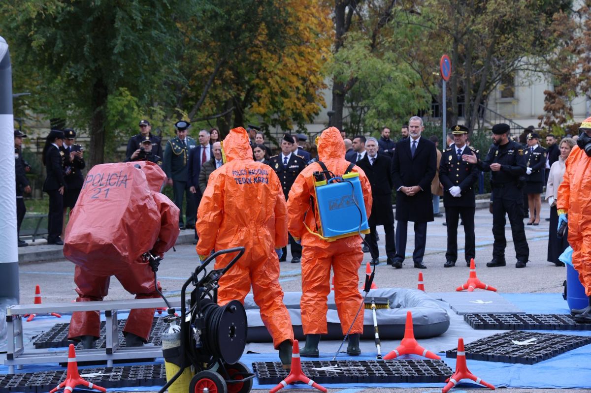 Felipe VI presidió este lunes el acto conmemorativo por el 50 aniversario de la unidad Tedax-Nrbq y los 30 años de la Unidad Central de Ciberdelincuencia en "el corazón de la Policía Nacional", el Complejo Policial de Canillas, tal y como afirmó el director adjunto operativo del Cuerpo, José Ángel González.