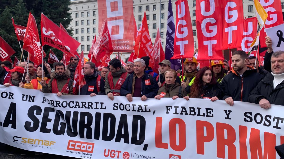 Los sindicatos ferroviarios se concentraron este martes ante el Ministerio de Transportes y Movilidad Sostenible para pedir que los accidentes mortales de Adamuz (Córdoba) y Gélida (Barcelona) sean un “punto de inflexión” para conseguir cambios en el sector.