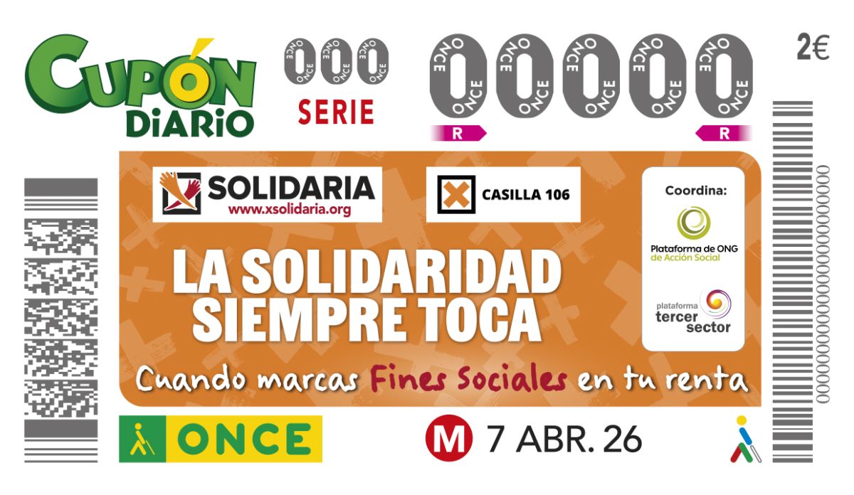 La ONCE dedicará su cupón del martes, 7 de abril, a la conocida como ‘X Solidaria’, la Casilla 106 de Fines Sociales de la Declaración de la Renta. Cinco millones de cupones llamarán a marcar esta casilla, con el lema ‘La solidaridad siempre toca’.