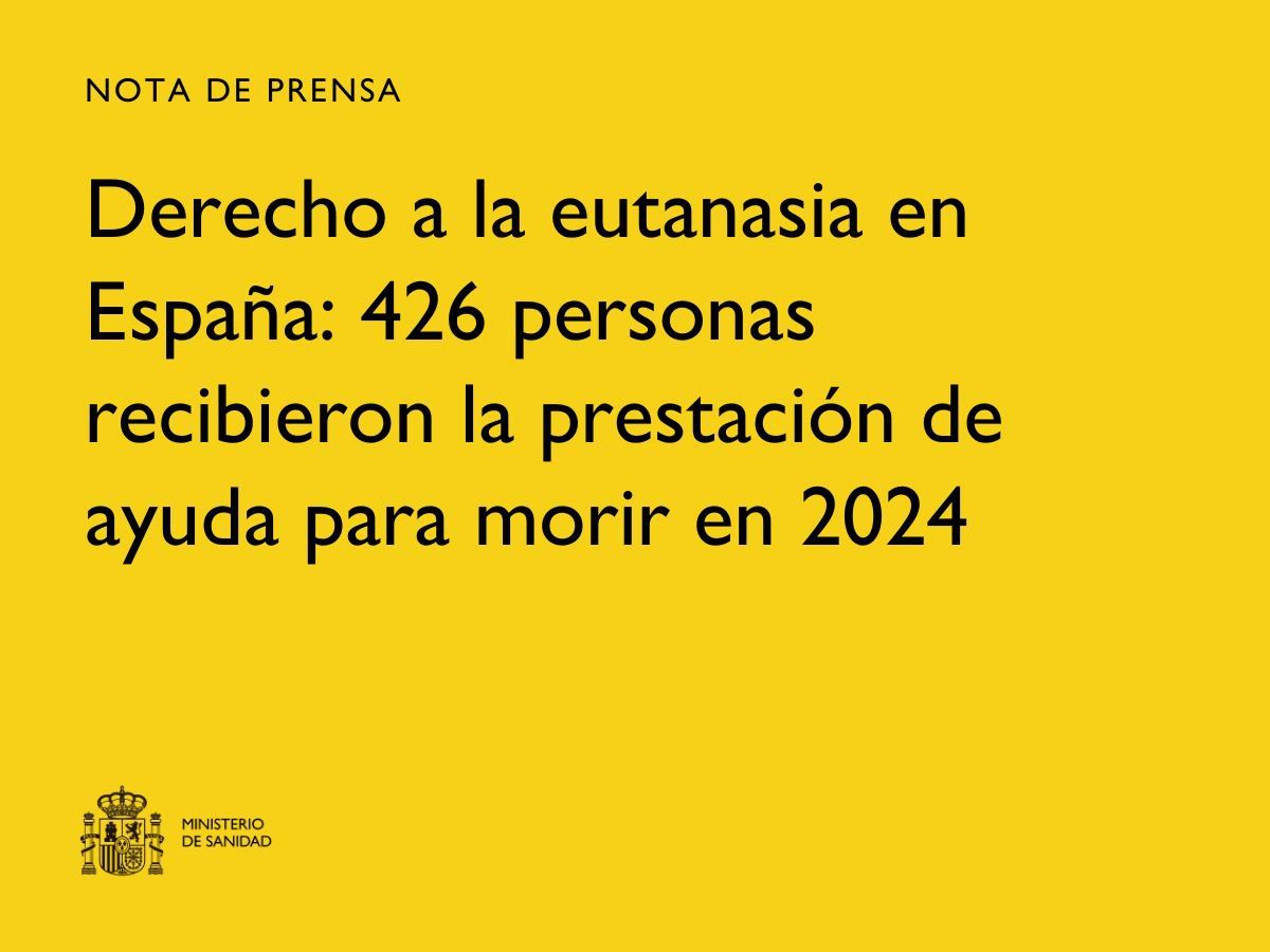 Un total de 426 personas recibieron la eutanasia en España en 2024, según el ‘Informe Anual de 2024 sobre la Prestación de Ayuda para Morir’ que acaba de publicar el Ministerio de Sanidad, que recoge la evolución de este derecho sanitario en el Sistema Nacional de Salud (SNS).