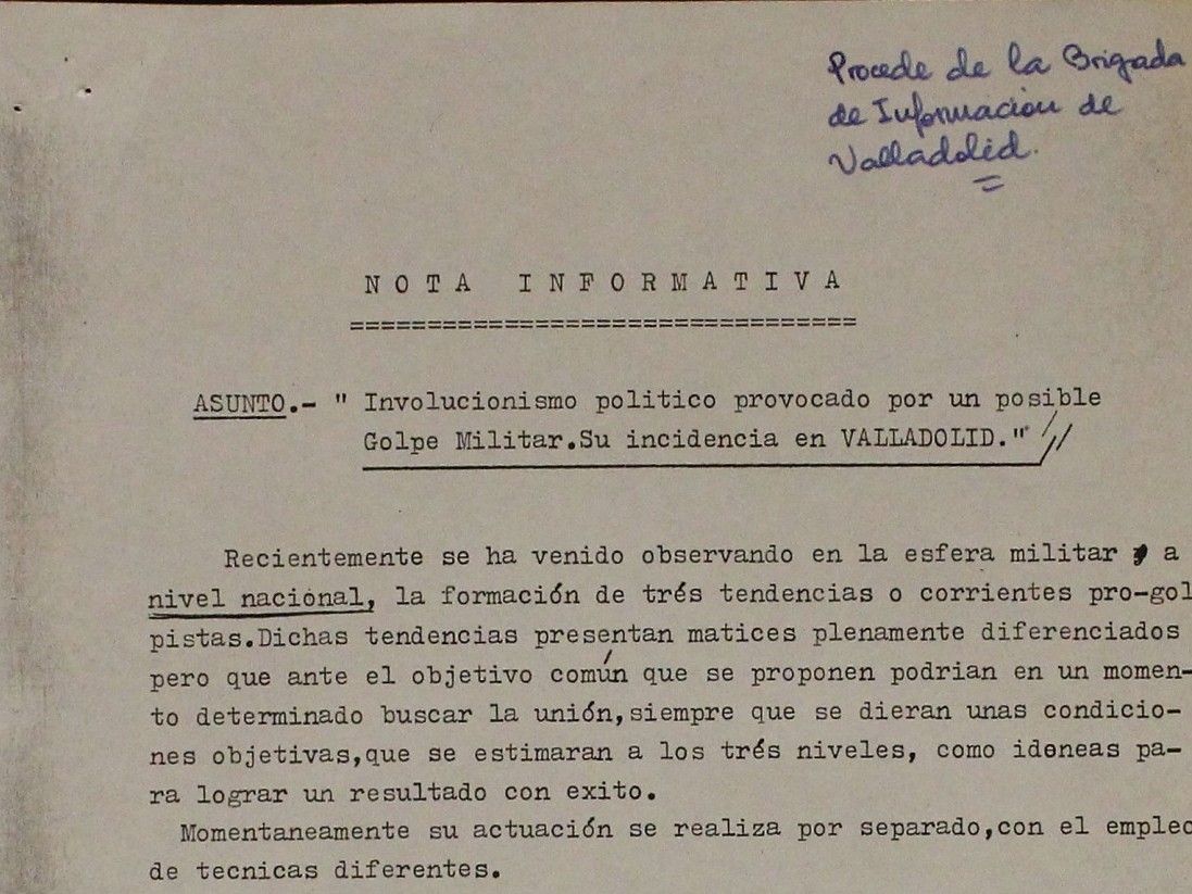 Una nota informativa, sin firmar ni fechar, alertaba, tras el intento de golpe de Estado del 23-F, de que se observaba "en la esfera militar y a nivel nacional" la formación de "tres tendencias o corrientes progolpistas". Aunque se aseguraba que tenían "matices plenamente diferenciados", se remarcaba que compartían un "objetivo común" y podrían "buscar la unión" para "lograr un resultado con éxito".